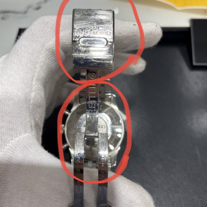 裏蓋部分とバックル部分ですが、特にバックル部分はキズが付きやすく、細かなキズがたくさん付いてしまっています。
