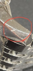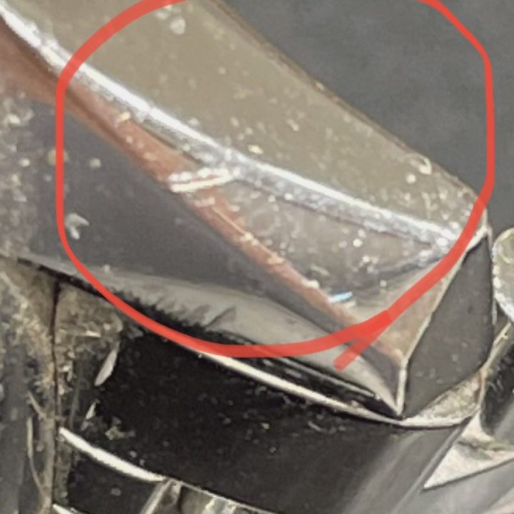こちらの画像は時計のラグ部分ですが、〇で囲った箇所にポリッシュをしても跡が残ってしまう凹みキズが付いていました。