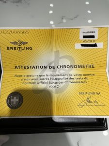 ブライトリングの付属品は箱とギャランティ、クロノメーター検査証、取り扱い説明書がセットになっています。