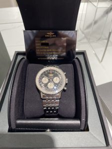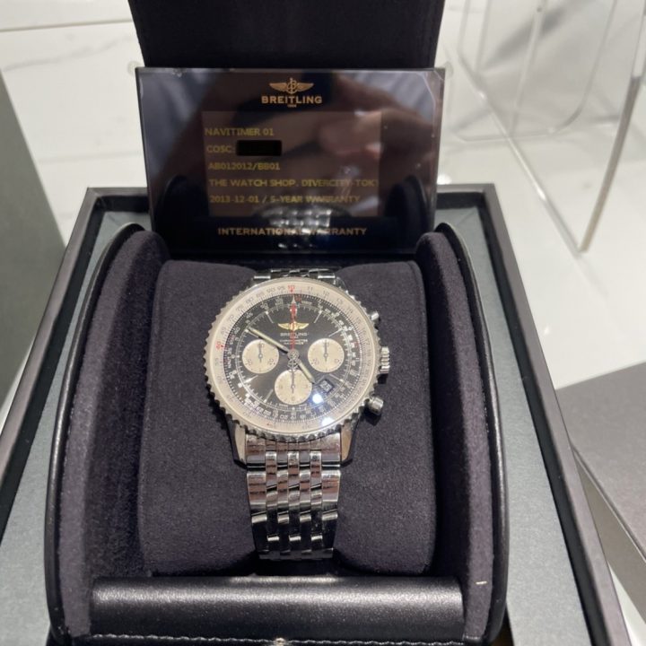 2026年4月の査定では、ブライトリング ナビタイマーAB0120の売却相談をいただく機会がありました。ナビタイマーはブライトリングの中でも長い歴史を持つクロノグラフシリーズとして知られており、航空時計としてのイメージを持つ代表的なモデルです。独特の回転計算尺ベゼルとクロノグラフのデザインはブライトリングらしい特徴で、長く愛用されている方も多い時計です。