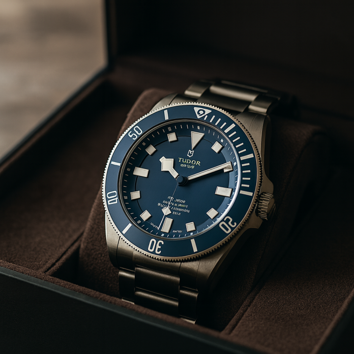 チューダーの技術力を象徴するペラゴス。防水性能500mを誇りながら、ブルー文字盤とマットな質感が調和した完成度の高いモデルです。 特にこのリファレンスは市場流通が限られており、安定した人気を維持しています。