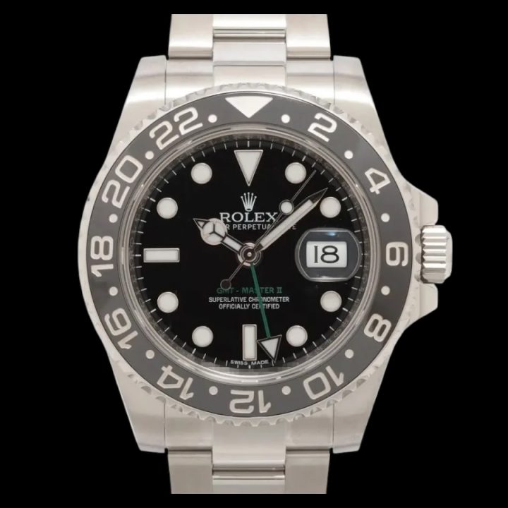 GMTマスターは1955年にパンアメリカン航空のパイロット向けに開発されたモデルで、複数の時間帯を同時に把握できる機能性が特徴です。Ref.116710LNは2007年に登場し、GMTマスターIIとして初めてセラミック製ベゼルを採用した記念的なモデルでもあります。ブラックセラクロムベゼルは耐傷性に優れ、経年劣化が少ない点が評価されており、スポーツモデルでありながら落ち着いた印象を与えるデザインが支持されてきました。搭載ムーブメントはCal.3186で、GMT機構の操作性と精度の高さに定評があり、実用時計としての完成度も非常に高い一本です。