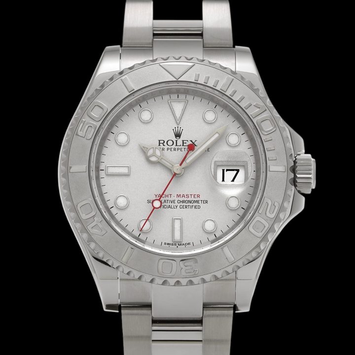 ヨットマスター Ref.16622は1999年に登場した初代ヨットマスター40mmのステンレス×プラチナモデルです。最大の特徴は、サンドブラスト仕上げが施されたプラチナ製ベゼルとダイヤルで、光の当たり方によって表情を変える上品な質感が高く評価されています。ケースサイズは40mm、搭載ムーブメントはCal.3135。堅牢性と精度に定評のあるムーブメントを備え、日常使いにも十分対応できる実用性を持ちながら、スポーツロレックスの中ではややドレッシーな立ち位置にあるモデルです。ダイバーズモデルとは異なり、マリンスポーツやリゾートシーンを意識したデザインコンセプトが、他のロレックスにはない魅力として支持されています。