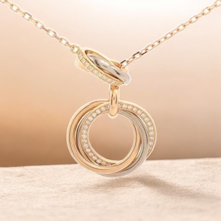 トリニティは、3色のゴールド(一般的にイエロー、ホワイト、ピンク)を重ねたリングデザインが象徴で、「愛・忠誠・友情」などの意味合いで語られることも多い名作です。ネックレスはその意匠を胸元でさりげなく楽しめるアイテムで、一本で上品にまとまり、重ね付けでも主張しすぎないのが魅力です。カルティエらしい曲線の美しさと、仕上げの上質さが、長く愛される理由だと思います。