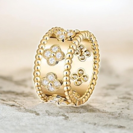 ペルレは、ヴァンクリーフ&アーペルを象徴するビーズモチーフを連ねたコレクションで、クラシックでありながら現代的な雰囲気を併せ持つ点が魅力です。ミディアムサイズは、華奢すぎず重たすぎない絶妙なボリューム感があり、一本で着用しても、他のリングと重ね付けしても美しくまとまります。シンプルなデザインだからこそ、素材の質感や仕上げの良さが際立ち、長く愛用できるジュエリーとして支持されています。