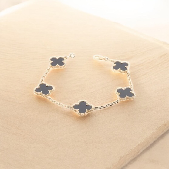 アルハンブラは1968年に誕生し、「幸運のモチーフ」として世界中で親しまれてきました。オニキスは深みのあるブラックカラーが特徴で、ゴールドとのコントラストが美しく、装いを引き締める存在感があります。ブレスレットタイプは手元にさりげない上品さを添え、季節やシーンを問わず使える点が大きな魅力です。流行に左右されないデザインであることから、長く価値を保ちやすいジュエリーとして評価されています。