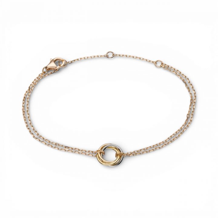 トリニティは、1924年に誕生したカルティエを代表するコレクションで、イエローゴールド、ホワイトゴールド、ピンクゴールドの3色のリングが絡み合うデザインが特徴です。それぞれ「愛・忠誠・友情」を象徴するとされ、シンプルでありながら深い意味を持つジュエリーとして長年支持されてきました。ブレスレットタイプは、手元に自然な華やかさを添え、年齢やシーンを問わず身に着けやすい点が魅力です。