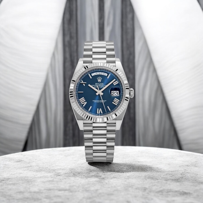 デイデイト40 Ref.228239は、プラチナ950製ケースを採用したロレックス最高峰ラインのひとつです。曜日表示がフルスペルで表示されるデザインは、デイデイトならではの象徴的な特徴で、他のモデルにはない格別な存在感があります。ケースサイズ40mmという現代的なサイズ感により、重厚感がありながらも実用性を兼ね備えています。プラチナ特有の落ち着いた輝きは、派手さよりも品格を重視する方から高い支持を受けています。