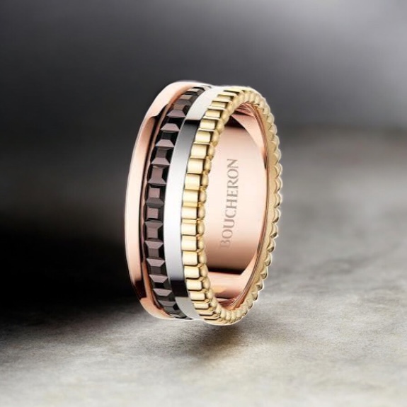 キャトル クラシック リングは、ブシュロンを代表するアイコンジュエリーです。複数の異なるテクスチャーと素材を組み合わせたデザインは、一目でキャトルと分かる存在感があり、世代を問わず支持されています。スモールサイズは主張しすぎないボリューム感で、単体でも重ね付けでも使いやすく、継続的な需要につながっています。