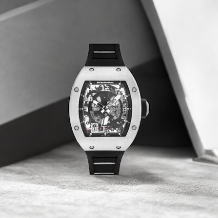 RM010 オートマティックは、リシャール・ミルの哲学である「軽量」「高剛性」「機構美」を体現した自動巻モデルです。最大の特徴は、スケルトン構造によってムーブメントそのものを見せる設計にあり、歯車やブリッジの立体感、部品の積層がそのままデザインとして成立しています。一般的な高級時計のように文字盤の意匠で魅せるのではなく、機械構造そのものを鑑賞対象とする点が、他ブランドにはない魅力です。ケース素材には複数のバリエーションが存在し、見た目の迫力に反して装着時の軽さを感じやすい点も評価されています。派手さはありますが奇抜すぎず、初めてリシャール・ミルを所有する方にも選ばれやすいモデルです。