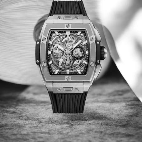 スピリット オブ ビッグバン チタンは、ラウンドケースが主流のビッグバンとは異なり、縦長のトノー型ケースを採用している点が最大の特徴です。ケース素材にはチタンが使用されており、視覚的なボリューム感に反して非常に軽く、実際に着用した際の負担が少ない点が評価されています。多層構造のケースやスケルトン仕様の文字盤は、ウブロらしい先進性を感じさせながらも、クロノグラフとしての視認性を確保しており、デザインと実用性のバランスが取れています。人と同じ時計を避けたい方、スポーツラグジュアリーの中でも個性を重視する層に選ばれやすいモデルです。