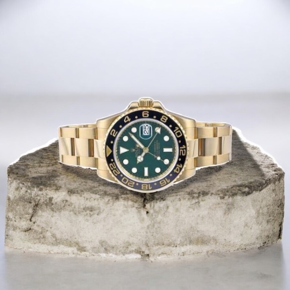 GMTマスターII 116718LNは、ロレックスの中でもスポーツモデルに分類されながら、ケース・ブレスレットともにイエローゴールド無垢で構成されたラグジュアリー性の高いモデルです。ブラックセラミックベゼルとグリーン文字盤、通称グリーン針の組み合わせは一目で分かる個性があり、ステンレスモデルとは明確に別ラインとして評価されてきました。実用性よりも資産性・所有満足度を重視する層からの支持が厚く、流通量が限られる点も特徴です。