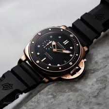 サブマーシブル ゴールドテックは、パネライの中でも明確に“ラグジュアリースポーツ”に位置づけられるモデルです。最大の特徴は、独自素材であるゴールドテックケースにあります。一般的なピンクゴールドよりも硬度を高め、傷が付きにくい配合が採用されており、重量感と実用性を両立しています。サブマーシブルらしい大型ケースと逆回転防止ベゼル、視認性の高いダイヤルは健在で、素材が変わっても本質はプロフェッショナルダイバーズです。金無垢でありながら、あくまで“使う時計”として設計されている点が、このモデルの個性と言えます。