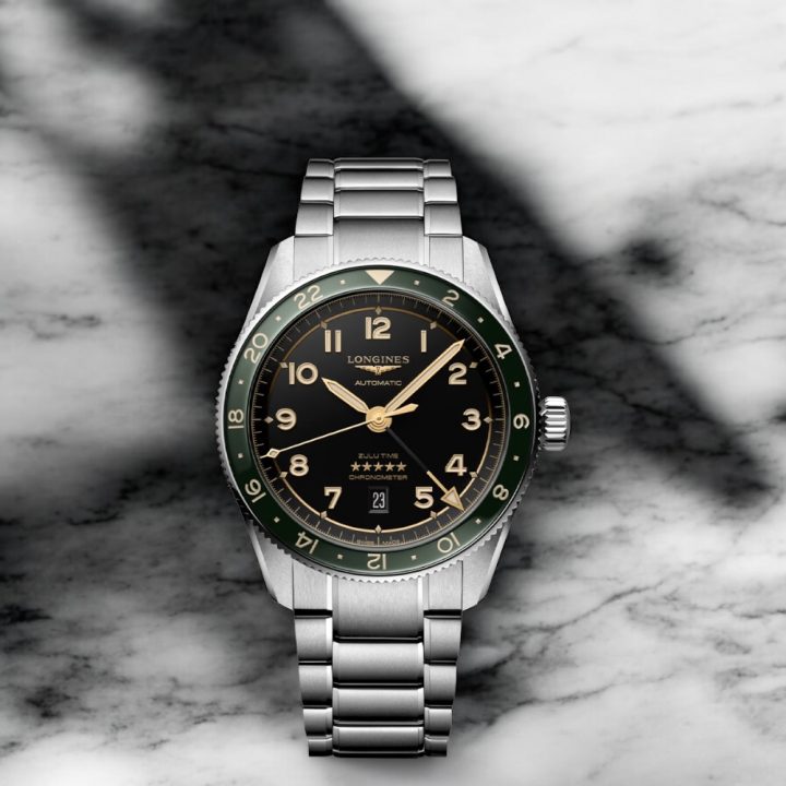 ロンジン スピリット Zulu Timeは、ロンジンが長年培ってきた航空時計の歴史を現代的に再構築したシリーズです。モデル名にある「Zulu Time」は、航空業界で使用される協定世界時(UTC)を意味し、GMT機能を象徴しています。L3.812.4.63.6は、39mmケースを採用したバランスの良いサイズ感が特徴で、日本人の腕にも収まりやすく、オンオフ問わず使用しやすい設計です。文字盤はマットなブラックカラーで、夜光塗料を施したアラビア数字インデックスと針により、高い視認性を確保しています。セラミック製の双方向回転ベゼルには24時間表記が施され、第二時間帯の把握が直感的に行える構造です。ムーブメントにはCOSC認定クロノメーターであるキャリバーL844.4を搭載し、約72時間のパワーリザーブと耐磁性能を備えています。実用時計として必要な要素を高い次元で満たしている点が、このモデルの立ち位置を明確にしています。