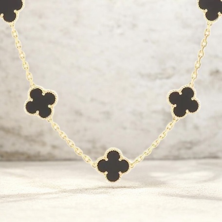 ヴィンテージアルハンブラ ネックレスには複数の素材や石の種類があります。マザーオブパールやオニキス、マラカイトなどはアルハンブラシリーズでもよく知られている素材です。素材や石の種類によってジュエリーの印象が変わるため、市場での評価にも違いが出ることがあります。