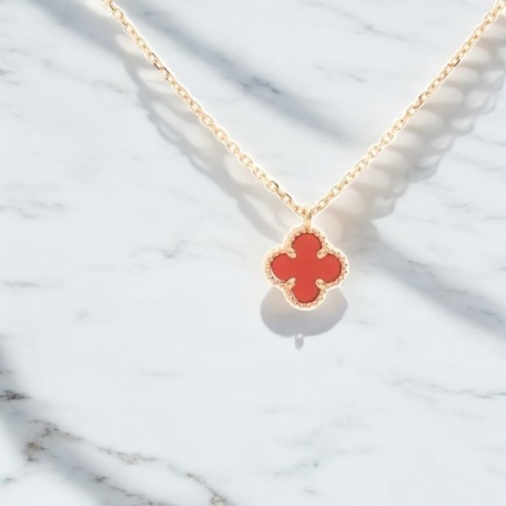 スウィートアルハンブラ ネックレスには複数の素材や石の種類があります。マザーオブパールやオニキス、カーネリアンなどはアルハンブラシリーズでもよく知られている素材です。素材や石の種類によってジュエリーの印象が変わるため、市場での評価にも違いが出ることがあります。