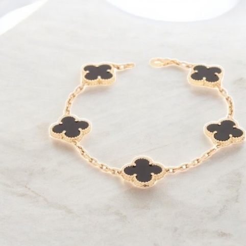 ヴィンテージアルハンブラ ブレスレットには複数の素材や石の種類があります。マザーオブパールやオニキス、カーネリアンなどはアルハンブラシリーズでもよく知られている素材です。素材や石の種類によってジュエリーの印象が変わるため、市場での評価にも違いが出ることがあります。