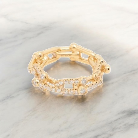 リンク構造のジュエリーはシンプルでありながら動きのあるデザインを生み出すことができます。ハードウェアリングもチェーンの形状を取り入れた構造になっており、ジュエリーとしての立体感が特徴です。シンプルなリングとは異なり、少しボリューム感のあるデザインとして展開されています。