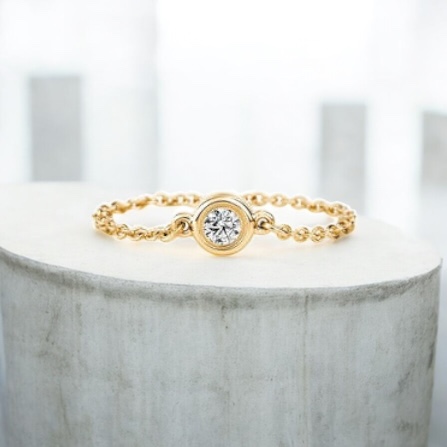 ティファニー バイザヤード リングは一粒ダイヤモンドをベゼルセッティングで留めたシンプルなジュエリーです。ダイヤモンドの周囲を金属で囲む構造になっており、石の輪郭を強調するデザインになっています。装飾を抑えたデザインでありながら、ダイヤモンドの輝きをしっかり感じられるジュエリーです。