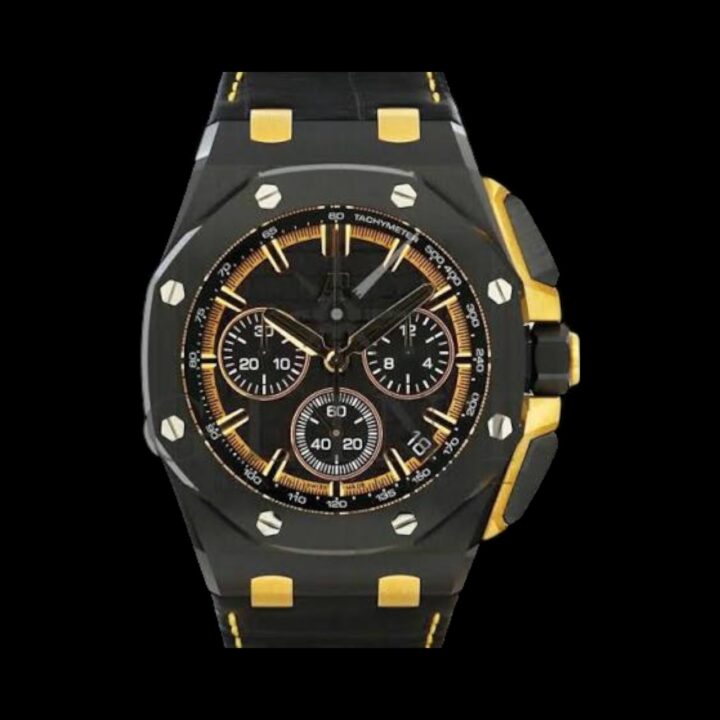 26420CEはロイヤルオークオフショアのクロノグラフモデルで、ブラックセラミックケースを採用した存在感のある1本です。ステンレスモデルとは異なり、傷が付きにくく高級感のある質感が特徴で、スポーツラグジュアリーの中でも個性的なポジションを確立しています。